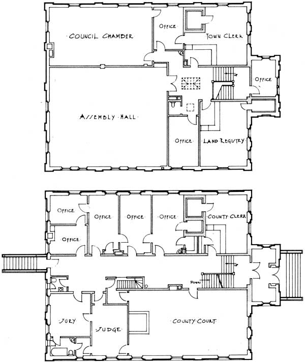 Floor plans of The Pas Court House showing the second floor at top and the main floor at bottom (circa 1930)