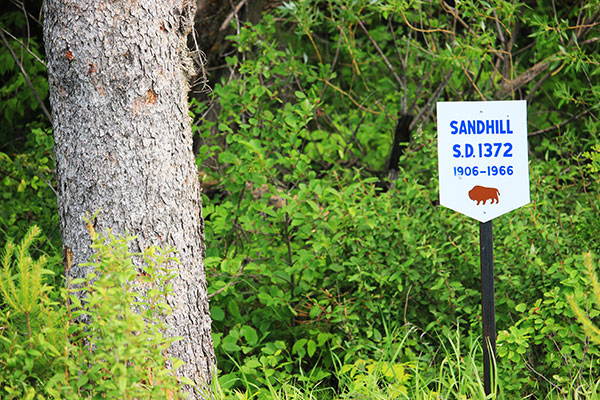 A sign marks the former school site, along with the school's shelterbelt of trees.