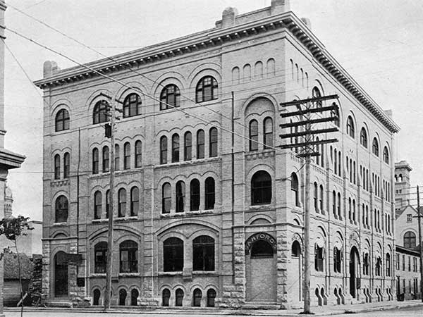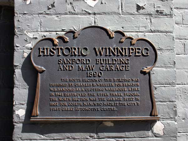 This building was designed by Charles H. Wheeler for Senator W. E. Sanford and erected on Bannatyne Avenue in 1890 as a clothing warehouse. A fire in 1941 destroyed the upper three floors so, today, only the ground floor remains. A plaque is mounted on the southeast corner of the municipally-designated historic building.