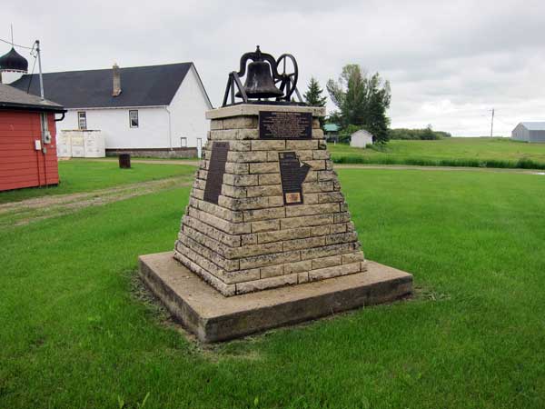 This monument in Angusville in the Rural Municipality of Riding Mountain West commemorates the 100th aniversary of the Rural Municipality of Silver Creek in 1984. It is topped by the former Angusville town bell. In addition to serving as a fire bell, it was rung four times each day: 12 noon, 1:00 PM, 6:00 PM, and 9:00 PM. The bell and its tower, at the corner of Main Street and Wrights Avenue West, were disposed of in the late 1960s. The bell’s whereabouts were unknown until it was discovered on the bottom of a nearby lake. The monument also commemorates local pioneers, veterans, and the founding municipal council, and schools that operated in the area through the years: