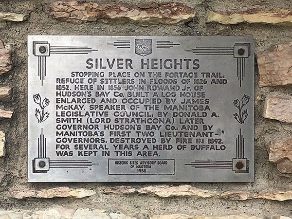 Silver Heights was a stopping place on the Portage Trail and refuge of settlers during the floods of 1826 and 1852. Here, in 1856, John Rowand Jr. of the Hudson’s Bay Company built a log house that was enlarged and occupied successively by James McKay, Speaker of the Manitoba Legislative Council, by Donald Alexander Smith (Lord Strathcona) later Governor of the Hudson’s Bay Company, and by Manitoba’s first two Lieutenant-Governors. It was destroyed by fire in 1892. For several years, a herd of bison were kept in this area.