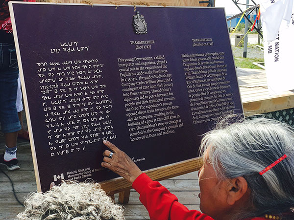 A monument in Churchill was erected in 1967 by the Churchill Ladies Club to commemorate a Chipewyan woman named Thanadelthur (also known as Slave Woman) who, in 1716, brokered peace between her people and Crees that made possible to establishment of a fur trading post in 1717.