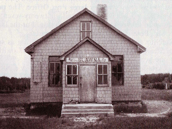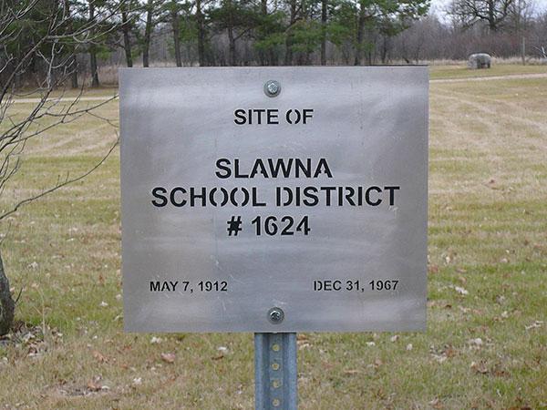 The Slawna School District was established in May 1912 and a one-room schoolhouse operated at NW13-5-6E in the Rural Municipality of Hanover. In 1968, the district was dissolved and its area became part of the Hanover School Division. The former school building was sold for $151, and the land and toilet were sold for $52. A commemorative sign was erected in 2005-2006 by the Bohdan “Bob” Osadchuk (1939-2006) and the District School Heritage Association.