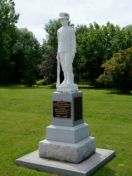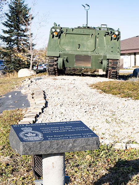 A monument in Dugald, in the Rural Municipality of Springfield, was erected in commemoration of people from the local area killed during military service. Beside the monument is an armoured personnel carrier brought here by the Springfield Branch #146 of the Royal Canadian Legion.
