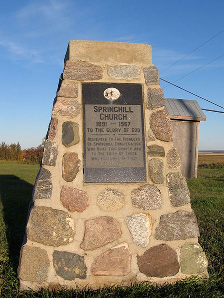 A monument in the Rural Municipality of Rosedale marks the location of the former Springhill Church, built here in 1891. Initially used by a Methodist congregation, it became Springhill United Church in 1923 and operated until closing in June 1967. The grounds are used for a community hall built in the early 1980s.