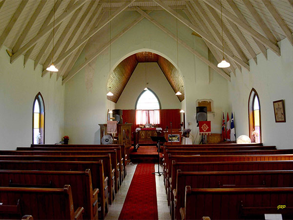 Eight pointed Gothic windows, set with coloured glass light the interior, while a large stained glass window formerly behind the altar has been re-located to the town museum. The original artistic wooden furnishings, pews and organ all remain beneath the exposed wood trusses of the dramatic interior. While the church served the community of this small agricultural town for decades, it closed in the 1970s but is revitalized with a new faith community as The Old English Church and is being lovingly restored.