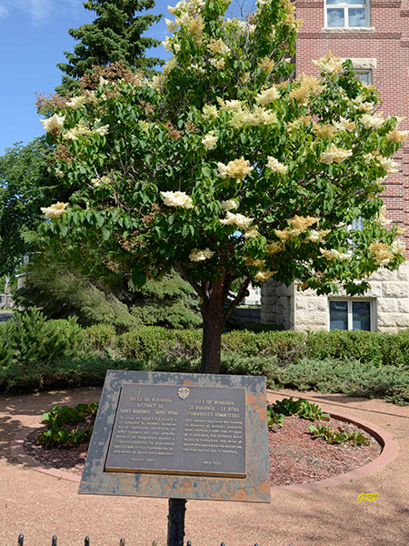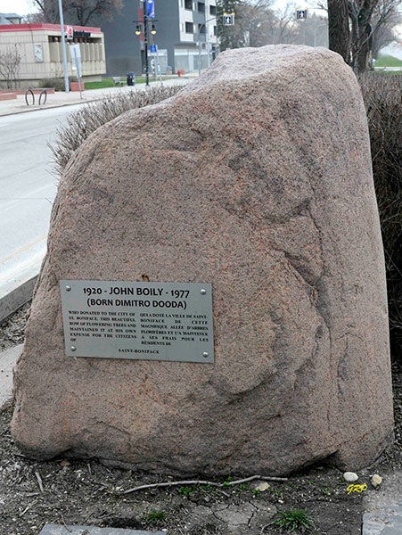 On the median of Provencher Boulevard in front of City Hall is a commemorative plaque for John Boily [nee Dimito Dooda] who donated and maintained the nearby row of flowering trees.