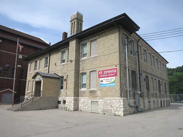 This two-storey brick building next to St. Edward’s Roman Catholic Church houses St. Edward’s School. Established in 1909, the school building was constructed by contractor D. H. Barlow and opened for classes in grades 1 to 4 on 8 November 1909. The structure had four classrooms, a priest’s residence, and a small chapel.