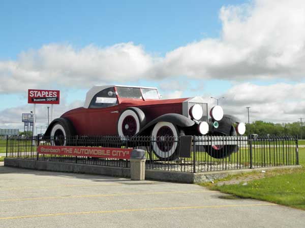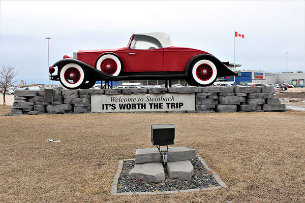 Steinbach’s first automobile dealership was established in 1914 by Jacob Reimer Friesen, becoming the first Ford automobile dealership in western Canada. Others soon followed. After the Great Depression, car sales increased and, by the 1950s, as a result of aggressive promotion, Steinbach became known as “The Automobile City”. By 1991, exhorted by the promotional slogan that “it’s worth the trip”, people from Manitoba, Ontario and elsewhere came to Steinbach to purchase vehicles. This replica of a 1931 Rolls Royce Roadster is about double the size of the original: 40 feet in length, 12 feet wide, and 11½ feet high. It was made by John Henry Friesen of John Henry Signs, in association with John A. Fehr.
