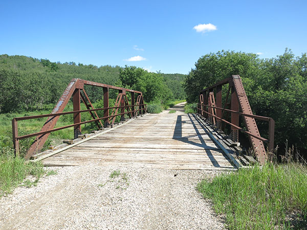 A small, steel pony truss bridge over the Birdtail Creek in the Municipality of Prairie View was constructed in 1923 by the Dominion Bridge Company of Winnipeg.