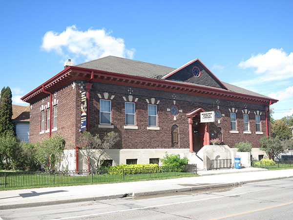 This one-storey dark red brick and Tyndall stone trimmed library building at the northwest corner of Salter Street and Machray Avenue in Winnipeg, measuring 40 feet by 80 feet, was designed by local architect John Nelson Semmens. It was built between 1914 and 1915 by the construction firm of Fraser and MacDonald at a cost of $28,800, with funds provided by industrialist Andrew Carnegie (1835-1919). It opened to the public on 2 June 1915 at a ceremony attended by Mayor Richard Deans Waugh, Alderman and chairman of the library committee Herbert Gray, and Archbishop Samuel Pritchard Matheson.