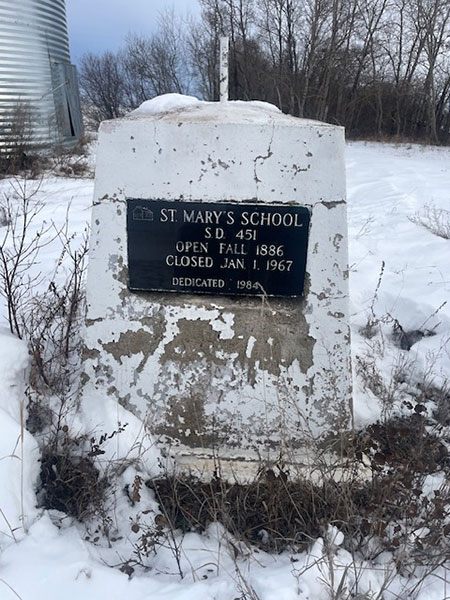 The St. Mary’s School District was organized formally in July 1885 and a school building was erected the following year on the southwest quarter of 30-20-26 west of the Principal Meridian in what is now the Rural Municipality of Riding Mountain West. It closed in January 1967 and remaining students went to Angus School No. 1487. The building, converted to a granary, still remains at the site and a monument dedicated in 1984 stands nearby.