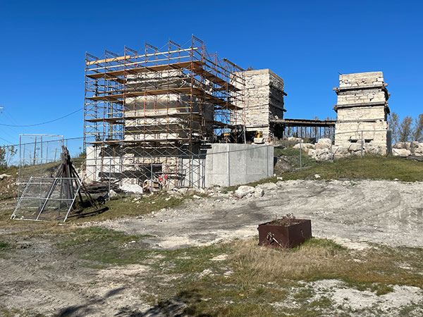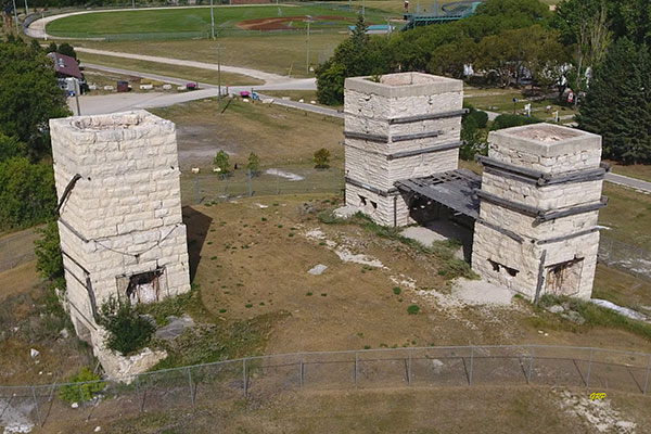 A three-phase “Save the Kilns” project began in 2019. The first phase involves rebuilding the youngest of the three draw kilns. It was carefully disassembled and its stones were labeled so they could be reassembled as they were before. It is expected to be completed by the end of 2024. This first phase is estimated to cost $1.8 million and contributions were received from Manitoba government, Town of Stonewall, Rockwood Quarry Producers, and private donors through the Interlake Community Foundation. When sufficient funds are raised, the next two phases will entail restoration of the other two draw kilns. There are no plans to restore the pot kilns, which are surrounded by a chain link fence.