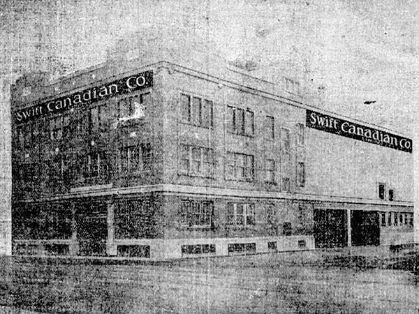 Formerly the site of a lumber yard beside the Roblin Hotel, this structure at the southeast corner of William Avenue at Adelaide Street in Winnipeg was built at a cost of about $58,000 by the firm of J. McDiarmid in 1911-1912. The three-storey brick, masonry, and reinforced concrete structure was built for the Swift Canadian Company Limited (SCCL), a wholesaler for an array of goods including meats, dairy, poultry, and other products. The company was formed when the Swifts Company of Chicago acquired J. Y. Giffin and Company a few years earlier and, in January 1911, renamed it as SCCL.