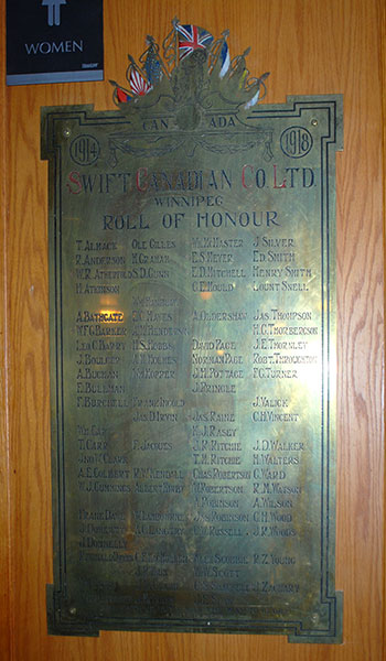 A memorial tablet containing the names of 84 Swift Canadian employees who served during the First World War was unveiled on 8 April 1919 by Captain John W. Wilton at the company’s Elmwood plant. Nine of its Winnipeg employees were killed in action, a list of whom is given below. The tablet was eventually given to the Elmwood Legion (Branch No. 9) at 920 Nairn Avenue in Winnipeg.