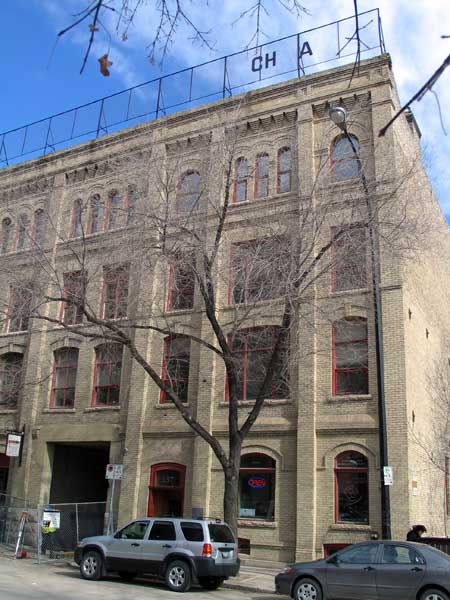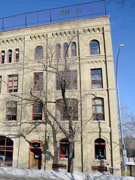 This building was the first of two identical, adjacent structures erected in 1882-1883 for the wholesale grocery business of Turner, McKeand, and Company. Designed by architects Mancel Willmot and George W. Stewart, the building at 137 Bannatyne Avenue featured light-coloured brick while its twin was built of red brick.