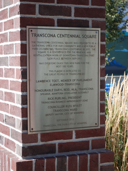 Located along Regent Avenue West in Winnipeg, the Transcona Centennial Square was established in 2012 for the centenary of the former Town of Transcona. Revitalization of this site was undertaken between 2009 and 2013, in part funded by the federal Building Communities though Arts and Heritage Program. A commemorative plaque was unveiled in September 2013 and affixed to the square's clock tower.