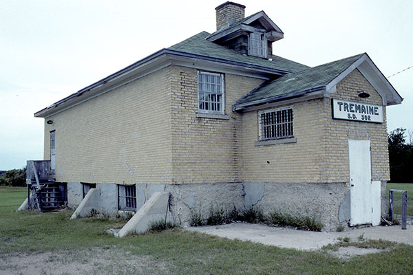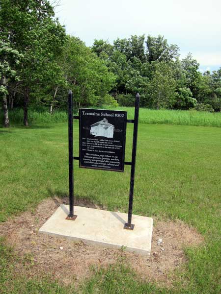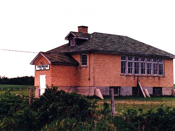 Originally known as Oak Grove School when it opened on the northeast quarter of 30-13-18 west of the Principal Meridian, in what is now the Rural Municipality of Minto-Odanah, the building was moved to SE36-13-19W in 1892, and renamed Tremaine. In 1915, it was replaced with a brick veneer building, constructed by contractor A. E. Jones of Brandon on the southeast corner of NE25-13-19W (about N50.13118, W99.93546). The school closed due to consolidation in 1968.