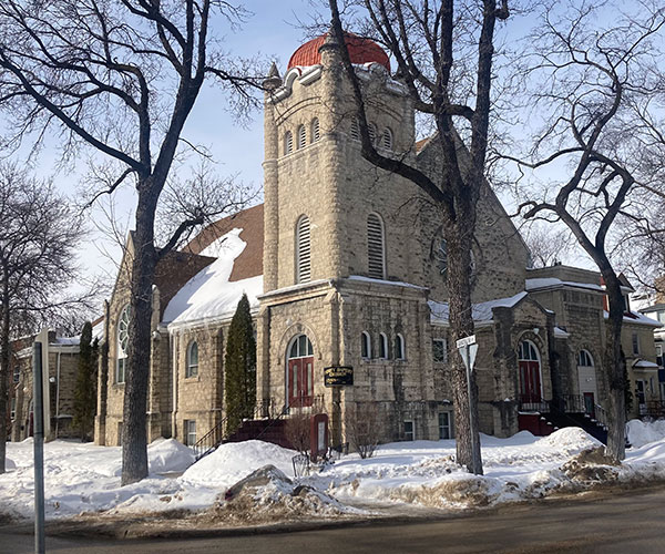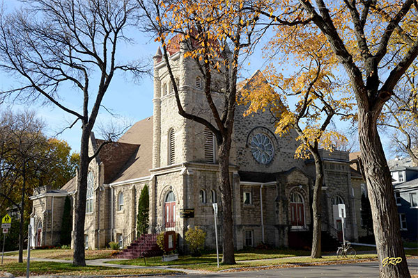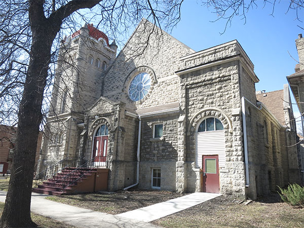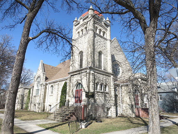 This stone church at the northwest corner on Gertrude Avenue and Nassau Street North in Winnipeg was built in two phases. The foundation, measuring 64 feet by 115 feet, was designed by local architect George Gaspar Teeter and built in 1907 by the construction firm of Fraser and MacDonald at a cost of about $5,500.