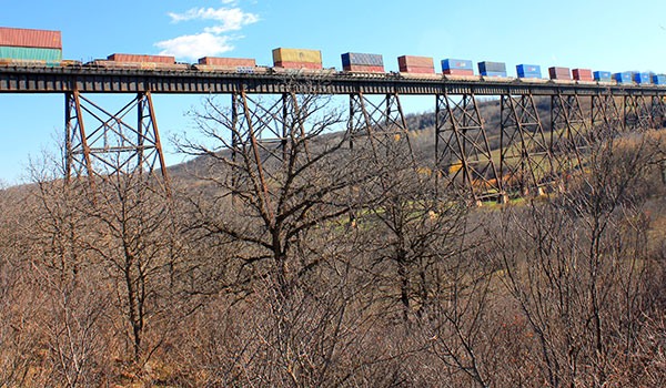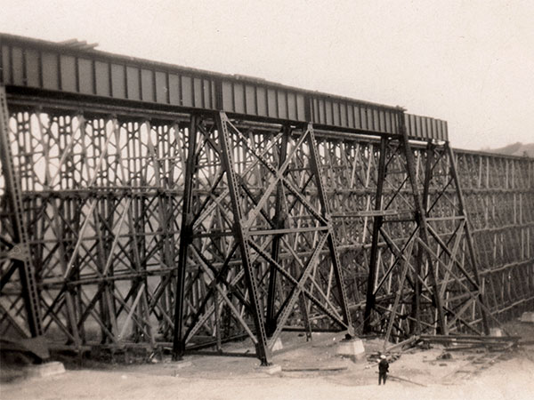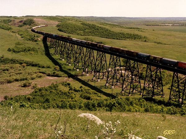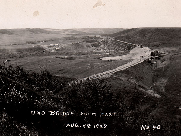 This steel trestle railway bridge over the Minnewashta Creek, on the CNR Rivers Subdivision near Uno in the Municipality of Prairie View, was built between 1928 and 1929. Measuring 18 feet wide by 1600 feet long, it used steel provided by the Manitoba Bridge and Iron Works and was completed at a cost about $250,000. It replaced an earlier wooden bridge from late 1915 that, in turn, replaced one destroyed by a tornado in September 1915.
