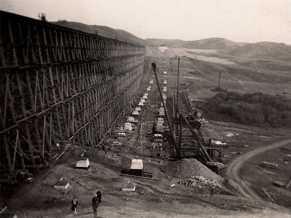 Concrete mounts for CNR steel bridge near Uno under construction at right alongside the earlier wooden bridge (1928)