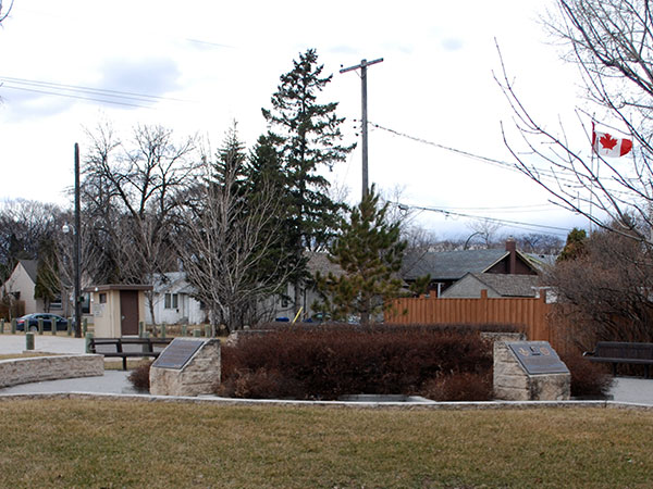 This site, once a nondescript bus loop on Sargent Avenue in Winnipeg, was re-designed in 2005 by David Wagner Associates to commemorate three First World War soldiers, Frederick William Hall, Leo Clarke, and Robert Shankland, who lived on the Valour Road (formerly Pine Street) and were awarded the Victoria Cross, the British Commonwealth’s highest military honour. Shaped like a Victoria Cross, the site has four bronze plaques mounted atop Tyndall-stone bases, along with a trio of metal silhouettes, one for each of the three soldiers along with a fourth plaque commemorating the significance of the Victoria Cross. The adjacent park at the northwest corner of Spruce Street and Sargent Avenue was dedicated at a ceremony on 27 May 2012, attended by Councillor Harvey Smith, Justice Minister / Attorney General Andrew Swan, and descendants of the three soldiers. The plaza is the site of local Remembrance Day ceremonies, previously always held at the Valour Road lightpost.