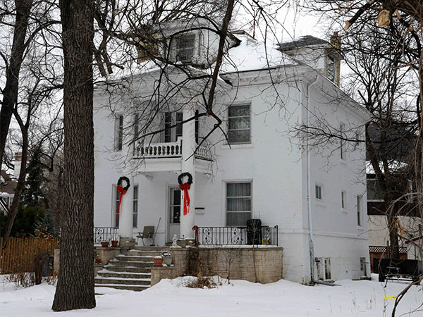 This two-storey brick and stone residence in the Armstrong’s Point area of Winnipeg was designed by local architect George Creeford Browne and built between 1903 and 1904 for Louis Verhoeven.