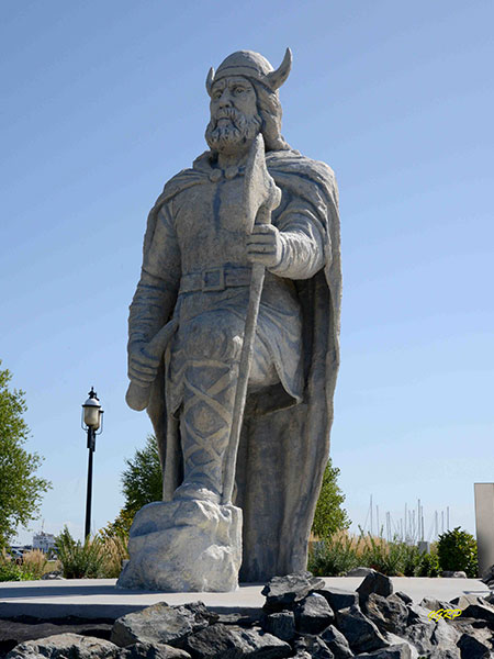 A 4.6 metre (15 feet) fibreglass statue of a Viking in Gimli was created as a Canadian centennial project by the Gimli Chamber of Commerce. Designed by Gissur Eliasson of the University of Manitoba, it was constructed by sculptor George Barone at a cost of $15,000. It was unveiled in 1967 by then-President of Iceland Asgeir Asgeirsson. A new Viking Park around the statue was unveiled on 5 August 2017 in recognition of the Icelandic Festival of Manitoba’s 125th anniversary and in honour of Canada’s 150th birthday. Around the pathways are stelae of various Icelandic persons and families from the area.