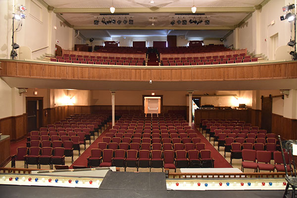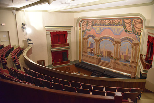 View of the stage and decorated curtain in the Virden Auditorium (June 2024)