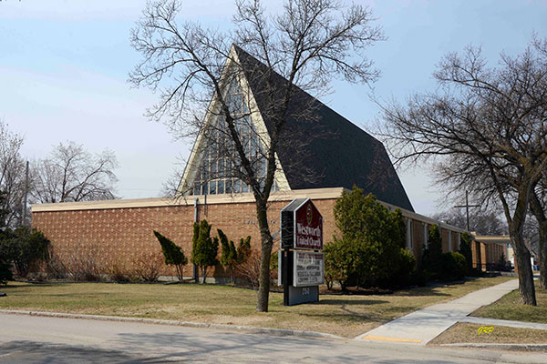 This United Church on Grosvenor Avenue in Winnipeg was designed by the architectural firm of Smith Carter Searle and Associates, and constructed in 1959 by H. E. Gibson and Company. A stained glass scene of the Last Supper was designed by artist Leo Mol.
