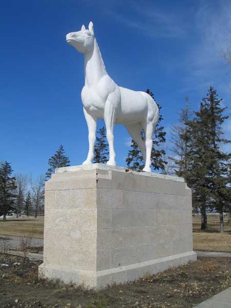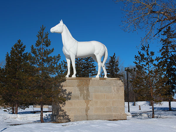 This statue beside the Trans-Canada Highway in the Rural Municipality of St. Francois Xavier, created by Winnipeg sculptor George Barone, commemorates an Indigenous legend that is described in the article below. It was erected by the Manitoba Tourist Association, with financial support of the White Horse Distillers Limited of Glasgow, Scotland and unveiled on 10 September 1966.