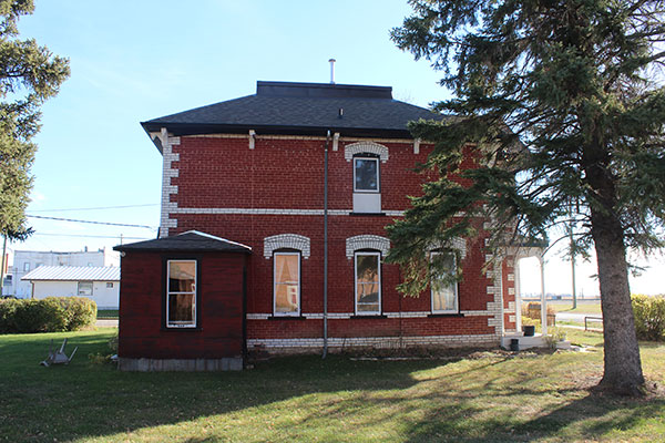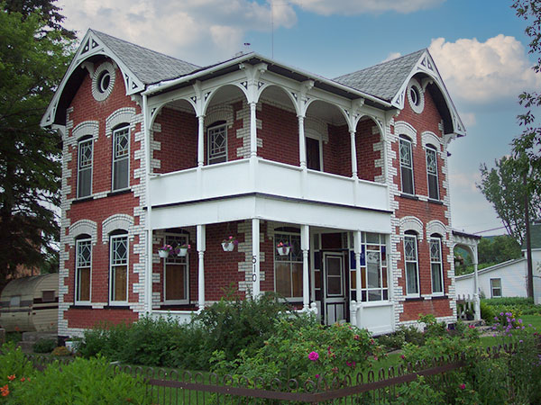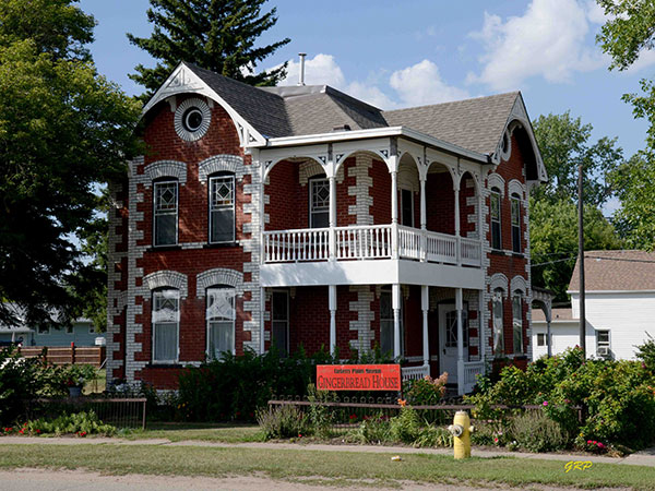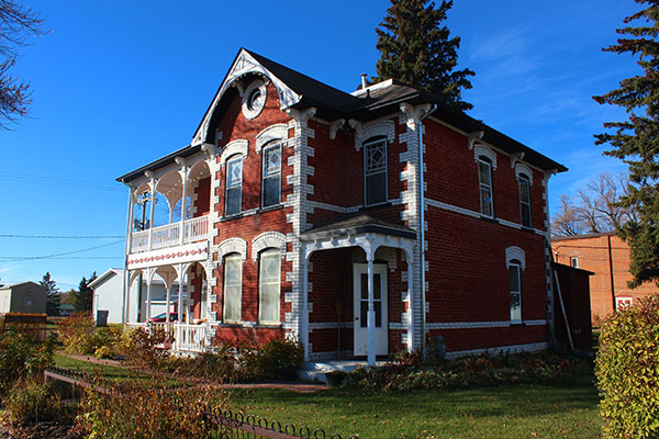 Built around 1900, the Queen Anne Revival styling and careful craftsmanship of the White House in Carberry reflect the Ontario heritage of its original occupant, contractor James White. Although many of the buildings in Carberry are made from brick made at the Sidney brickyard, the distinctive red bricks for this house were made at the Edrans brickworks, apparently because White’s wife had connections there. His company built several of the town’s noteworthy buildings, including his own sash and door factory next to the house, three nearby churches, and the Sear business block.