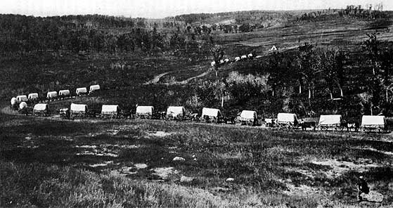 Charles Sibbald’s grey stallion, tied to the sixth wagon from the left hand side, identifies this to me as the train in which he went West. The man in the foreground may be identified by his hat as one of Mr. East’s party.