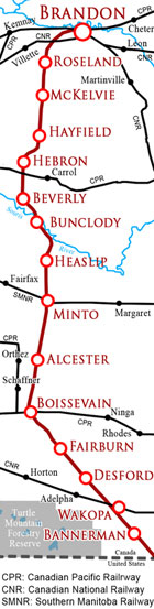 route edging northwards from Portage to a divisional point at Rivers
