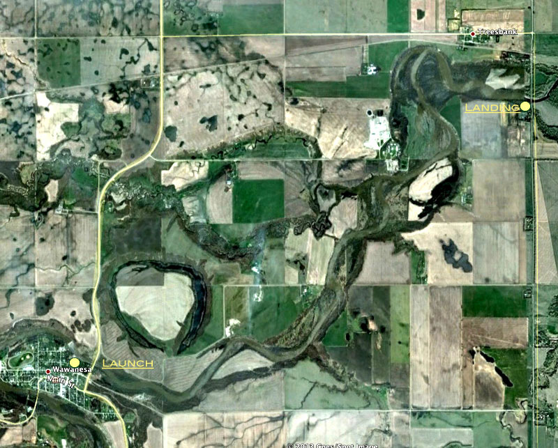 bridge spans the Souris near Treesbank. Take Highway #2 east from