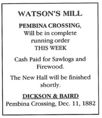 from the grist mill at Pembina Crossing, which is now dismantled.”