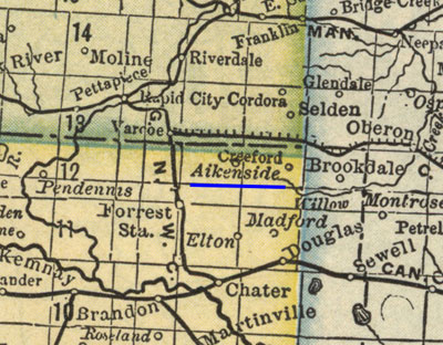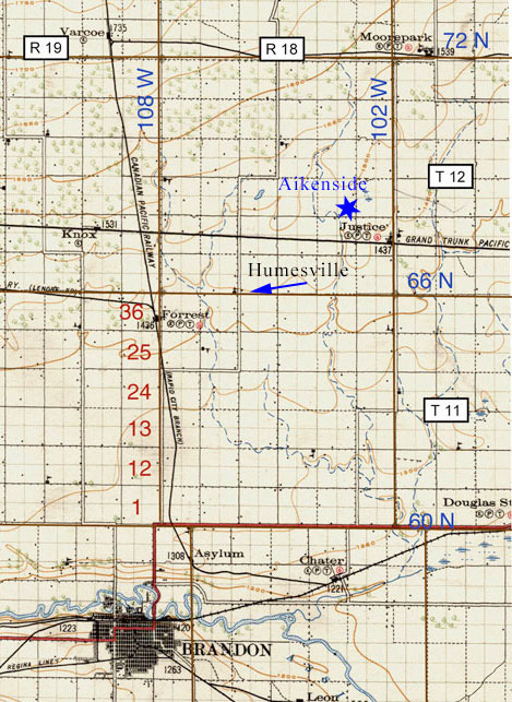 ![]() Aikenside received its name from the school by that name. A new school was built on the extreme NE corner of NE 24-12-18 in 1884. Dorothy Curle was the first teacher. One day while reading a book she came across the name Aikenside. She submitted the name for the school. It was accepted and this became the name of the district. In 1890 Aikenside had its beginning when Fred and Isaac Lewis established a store on the Southeast corner of Section 14-12-18 in which shortly thereafter a post office was set up with mail being brought from the C.P.R. on Tuesdays and Fridays by team. That same year William Street built a blacksmith shop and a house at the samecorncr and in 1801 Nelles School was built and opened across the road on the southwest corner of Section 13-12-18. The Lewises sold the store to Bert Waggoner who operated it until 1902 when he sold it to James Mitchell who ran it until 1908 by which time the Grand Trunk Pacific Railway had been built and begun operations at which time Isaac Mitchell bought the store and moved it to Justice on the new railway. Mr. William Street also moved his blacksmith shop to Moore Park, so Aikenside ceased to exist. During its years of existence across the road Section eleven was a school section and" still virgin prairie so the football field and baseball diamond were laid out. The old Aikenside Thistles Football Team were known through the North Brandon and Minnedosa areas as one of the best of their era. Tim Mitchell also built a closed rink at Aikenside where the whole area enjoyed skating and hockey. Hilda Blake, who in 1899 killed her employer, Mary Lane, and was the only woman executed in Brandon, served as a domestic on a farm in the Aikenside district, before taking employment at the Robert Lane household in Brandon. https://www.gov.mb.ca/rearview/blake/index.html ![]() |