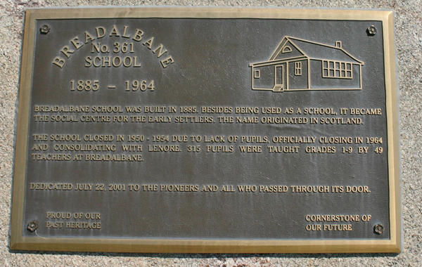Breadalbane Presbyterian Church The Presbyterian congregation of the Breadalbane district in western Manitoba was established in 1883. This municipally-designated historic site (2012), was constructed by stonemason C. B. Murphy in 1898. ![]() ![]() ![]() http://www.mhs.mb.ca/docs/sites/breadalbanechurch.shtml ![]() A stone monument listing the names of pioneers to the Breadalbane district, and their year of arrival between 1880 and 1900. Site Coordinates (lat/long): N49.91607, W100.78181 At the junction of Rd 62 N and 145 W ![]() Breadalbane Cemetery / Lenore Cemetery) N49.93023, W100.75971 http://www.mhs.mb.ca/docs/sites/breadalbanecemetery.shtml ![]() ![]() ![]() School 1885 - 1964 SE 14-11-25W N49.91654, W100.78348 http://www.mhs.mb.ca/docs/sites/breadalbaneschool.shtml ![]() ![]() |