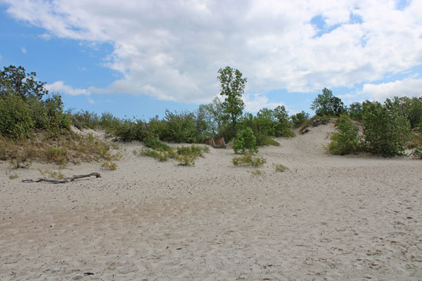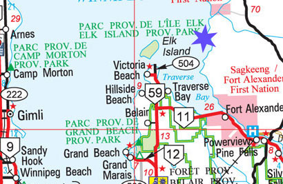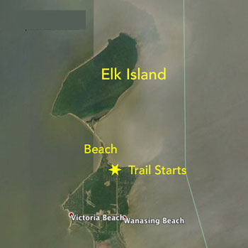 Drive to the end of Hwy 59. Park on the east side of the highway, walk east through a cottage development to a beach. In low water you can walk along the beach and across to the island.