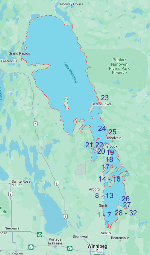 Collected here is a sample of photos of locations on the Lake - many with links to more detailed information. ![]() 2. Matllock ![]() 3. Winnipeg Beach ![]() 4. Sandy Hook ![]() 5. Willow Island ![]() 6. Gimli ![]() 7. Gimli ![]() 8. Misty Lake ![]() 9. Camp Morton Hiking Trails & Campground ![]() 10. Camp Morton ![]() 11. Spruce Sands ![]() 12. Hnausa Campground ![]() 13. Betsy Ramsay Grave ![]() 14. Gull Harbour - Hecla Island ![]() 15. Hecla Village - Hecla Island ![]() 16. Grindstone Point ![]() 17. Beaver Creek Campground ![]() 18. Biscuit Harbour ![]() 19. Calder's Dock ![]() 20. Pine Dock ![]() 21. Matheson Island ![]() 22. Black Bear Island (1973) ![]() 23. Berens River ![]() 24. Little Tamarack Island ![]() 25. Princess Harbour ![]() 26. Elk Island ![]() 27. Victoria Beach ![]() 28. Grand Beach ![]() 29. Grand Marais ![]() 30. Stephen's Island ![]() 31. Sunset Beach ![]() 32. Patricia Beach ![]() Manitoba Maritime Museum - Selkirk |