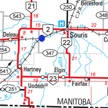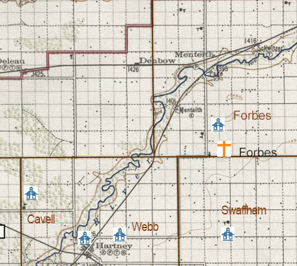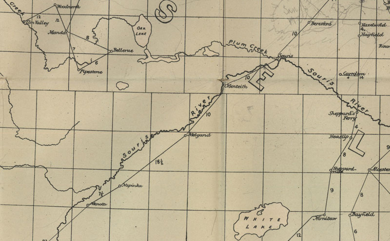 An elevator, station and Post Office between Souris and Hartney The bridge over the Souris River is called the Menteith Bridge. The Post Office, (and thus the community) existed before the raiway. The elevator was located a few km SW of the bridge. ![]() ![]() Post Office Locations: NE 1/4 Sec. 7, Twp. 7, R. 22, WPM NE Sec. 7, Twp. 7, R. 22, WPM - 1932-09-01 NW 1/2 Sec. 9, Twp. 7, R. 22, WPM Sec. 21, Twp. 7, R. 22, WPM Sec. 7, Twp. 7, R. 22, W1 - 1884-01-01 Dora Dodd became the postmistress of Menteith Post Office, when it was moved from Page Siding. She was postmistress for eighteen years until it closed. Mr. Rhinehart was the agent at Page elevator. The Menteith post office was in this home until 1907. The Menteith Post Office was in John Abrey's home from 1907-1922. It was then moved to Schwitzer where Mrs. Loberg was Postmistress. Menteith post-office was operated out of Schwitzer for a number of years, with Mrs. Loberg as post-mistress. Catching a train at Menteith or Schwitzer (also Page in the early years), allowed an afternoon of shopping in Souris and coming back about 4:00 pm. ![]() The Menteith on the northeast corner of 8-7-22 west of the Principal Meridian, was built in 1890. It closed in 1919 as local children began attending the Deleau Consolidated School. http://www.mhs.mb.ca/docs/sites/menteithschool.shtml ![]() ![]() ![]() |