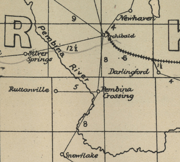 The Boundary Commission Trail crossed the Pembina River in a broad valley south of present day Manitou. Crossings were often likely spots to establish a Stopping Place and other services. As always, good crossings on the Boundary Trail were not necessarily chosen by the railway. ![]() ![]() ![]() “Pembina Crossing 1882. (From the Manitoba Mountaineer, Nelsonville, Manitoba) This city is known as the Pembina Crossing and this is written at the Pioneer's Rest, and William P. Hutchinson, proprietor - a first class host who boasts a billiard table, a sample room, a new organ and organist, with lots of good singing every night, a splendid bill of fare, and all for $4.00 per week. Ten regular boarders, besides his own family and hired help. Is furnishing wood for grist mill that is running here. It is grinding for fifteen cents per bushel. Take that, ye extortionists. The town boasts a general store, post office, a blacksmith shop, two hotels. William and his sister, Jeannette, established a Stopping Place and a butcher shop at Pembina Crossing in the early 1880's for the benefit of the homesteaders who were using that route to enter Canada from the United States. Some other press clipping from the era provide additional details… June 2, 1881. The Queen's birthday (May 24) was royally celebrated here by a large assembly in the following manner: foot races, horse race, pony race, a lively game of baseball was much enjoyed by the boys. We were also glad to see a grand turnout of the much- needed sex in Manitoba. (Emerson International.) "Mr. H. H. Black, a dentist by profession, arrived in the Pembina Crossing district from Emerson by team, in June 1880. He had married in Halifax, NS, and afterwards traveled through the United States as far as Colorado. His father (George C.) and his elder brother (George) lived in Winnipeg. H. H. Black did not wish to be a dentist and he loved "the outdoors." Therefore he took up a homestead (SEI/4 24-2-9W), but due to an injured foot, Mr. Black was unable to carry on with farming. ![]() Old St. Luke’s Pembina Crossing Anglican Church (Archives of Manitoba) Originally a general store, post office, and saloon, built in May 1880, this log building was in use until 1920 when it was replaced by a new building, which opened on 26 September 1920. The following year, by an unfortunate accident, it burned down although most of the furniture and fittings were saved. In 1922, it was replaced by the present structure, a municipally-designated historic site as of 2011. ![]() For more info visit the Pembina Manitou Archive https://pembinamanitouarchive.ca/ ![]() |