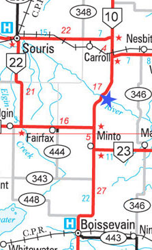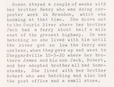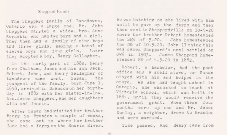 A ferry that operated from about 1882 until 1903 just east of where where Highway#10 now crosses the Souris River at Riverside. Sheppard's Ferry was on 21-6-19. When Iscouted the area there were only a few spots where a gentle approach and low banks would allow for a ferry site. This site, just east of the old bridge site is the most likely. ![]() And from east of the bridge ![]() Sheppard's Ferry was replaced by a bridge - the remains of which can still be seen. A Sheppard's Ferry Post Office was opened nearby in 1883 and closed in 1885. Maps show it on the south side of the river. ![]() ![]() ![]() ![]() ![]() ![]() Maps Plus (See the context...) Heritage Site Maps... |