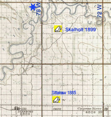 Glencoe Area SE 16-8-13 One of 3 known cemeteries exclusively for people of Icelandic descent. Eyjolfur Johnson – first burial - 1894 ![]() N49.66516, W99.17713 ![]() ![]() The Post Office was established in 1899 in the home of John J. Anderson Sec. 20, Twp. 8, R. 13 ![]() ![]() Historic Places... ![]() |