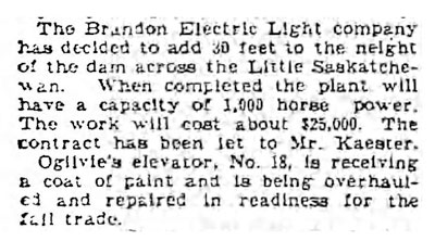 Situated on the Little Saskatchewan River, the 10 Mile Dam supplied the city of Brandon with power. The Brandon Electric Light Company built the dam in 1900 and it is considered Manitoba's first hydroelectic power generating station. The dam spanned approximately 80 meters and was constructed from timber and reinforced with clay and stone. The station was decommissioned in 1924 ![]() ![]() PASTForward - Winnipeg's Digital Public History ![]() ![]() ![]() Video... ![]() ![]() |