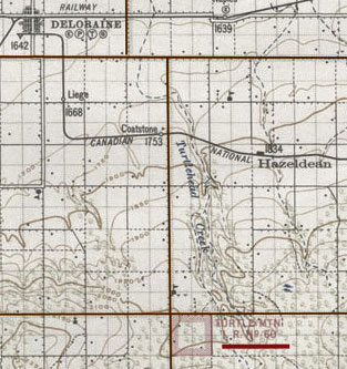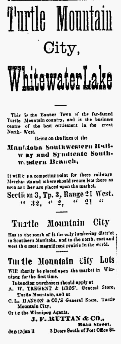 Turtle Mountain City, one of Maniotba’s earliest “Speculative Cities” was promoted by pioneer Englishman John Brondngeest, who hoped that the railway would cross his land. When that failed, he abandoned the site and made a fresh start along the new rail line. ![]() ![]() MapPlus... ![]() IR #60 - Turtle Mountain ![]() Turtle Mountain City & Waubeesh Sitting Eagle Turtle Mountain IR #60 |