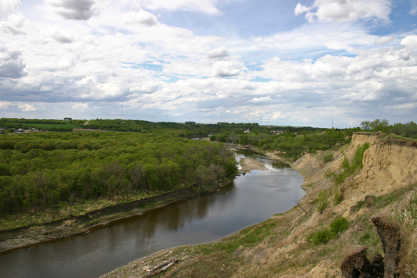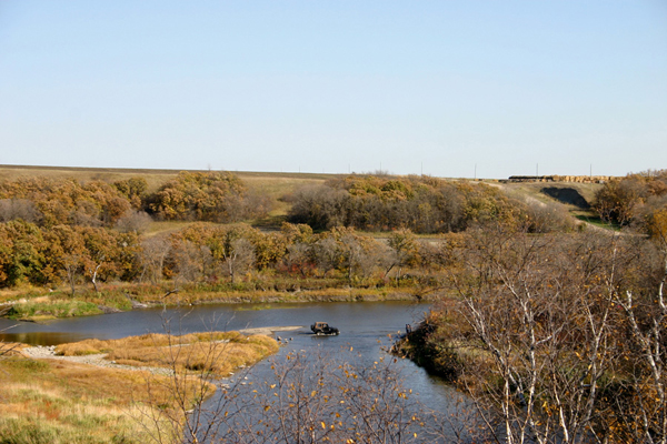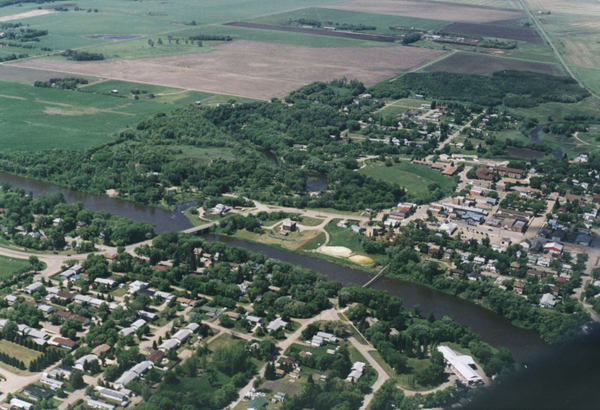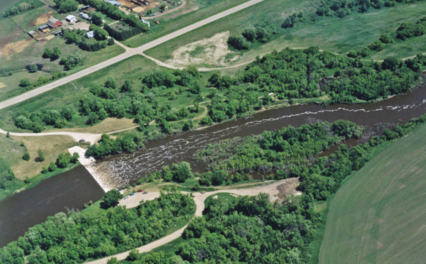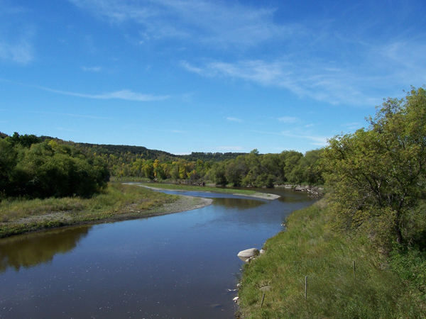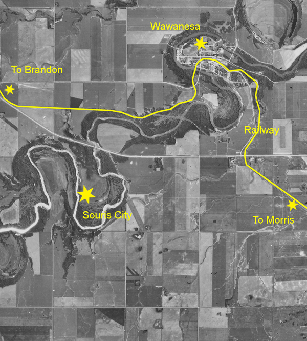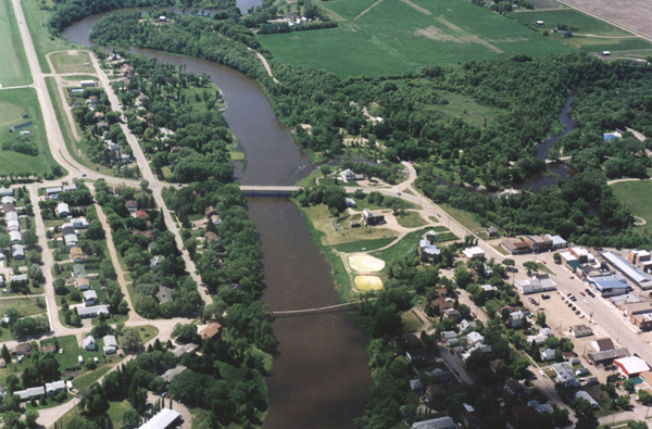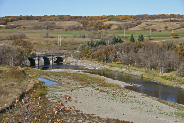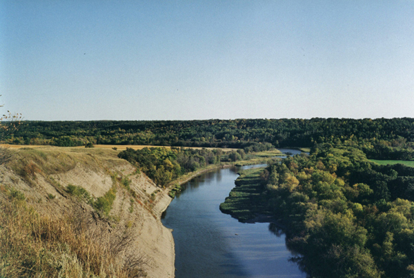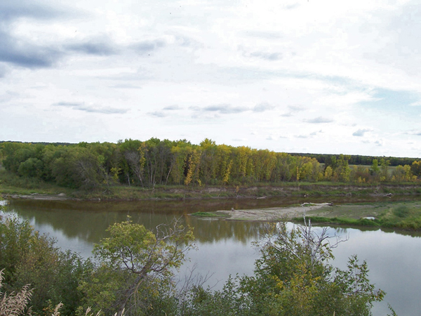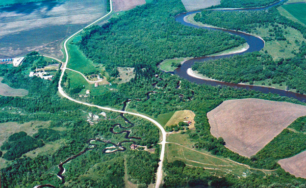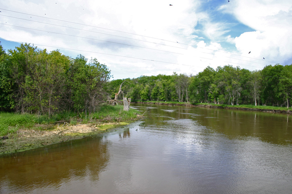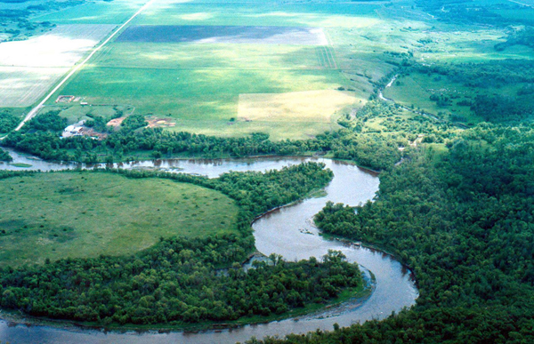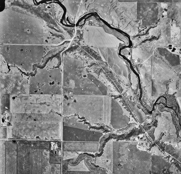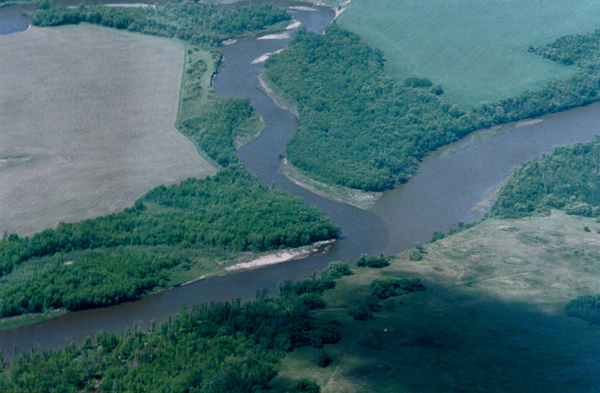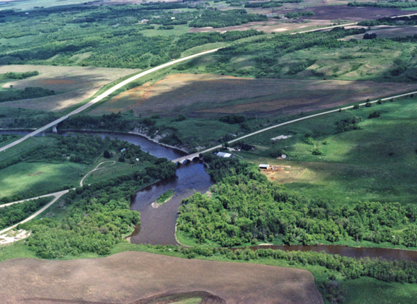 river enters a horseshoe bend as it approaches Highway #2 near Wawanesa.