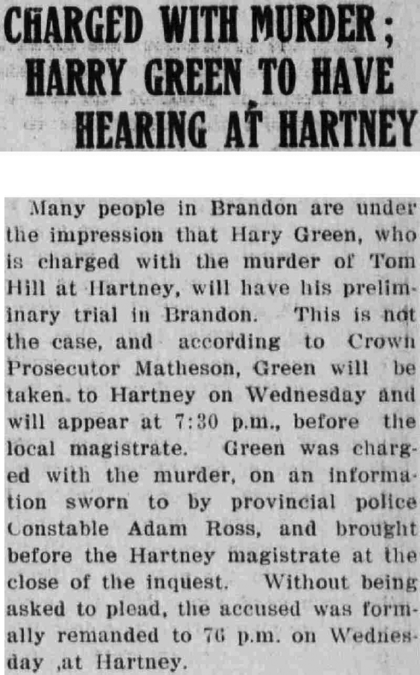 Mr. Green was held in Hartney Jail until the inquest in Hartney. The