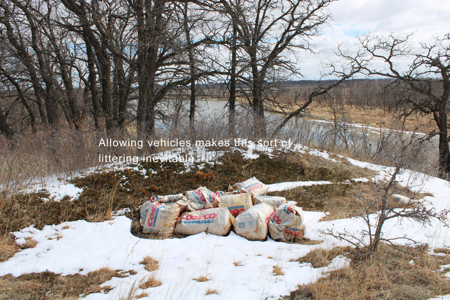 Vandalism and habitat destruction in this historically significant and beautiful location is clearly linked to unrestricted vehicle use and off-season firearm use. ![]() ![]() The juncture of the Assiniboine and Souris Rivers was a crossroads for Aborigional peoples, a hub of the fur trade activity in Western Manitoba, and a nucleus of the the early settlement of the Souris Plains and beyond. ![]() ![]() ![]() Souris Bend An Increase in ATV traffic destroys habitat and encroaches on the trail network built and mantained by local equestrians. ![]() ![]() The Souris Bend WMA has not seen the sort of vandalism and destruction seen at Souris Mouth, but a recent effort by ATV enthusiasts to convince the government to grant ATV's more access is troubling. As with other WMA's, keeping vehicles on designated trails is difficlult. I have hiked and paddled here for over twenty years and there is more vehicle trafic and more litter each year. That is no coincidence. The area is a spectacular example of river valley scenery, and is worthy of respect. If the purpose is to provide habitat for both plants and animals, then guns and motors have no role to play. The Lang's Crossing Area ![]() More Photos... Middle Camp ![]() The Gregory Mill Trail ![]() ![]() More Photos... More Info.... The Souris Bend Story False Starts Brandon Hills This well-used location close to Brandon is inappropriate as a place for hunting and any use of firearms. The Brandon Hills WMA presents a different set of opportunities and challenges. ![]() The first thing one might notice in the brandon Hills is that vehicles are not allowed. The effect of that restriction is obvious. Litter is almost non-existant except for a spot close to the parking lot that might attract partiers. Partiers and litterers don't seem too keen on walking any distance, so most of the area is in its natural state except for the well marked trails. There are a few lesson to learned here. As I might have mentioned, allowing vehicles invites damage and littering. And the very fact that the area is busy with people who like to walk, run, ski and bike makes it less likely that the eco-vandalism we see in other places will be prevalent. Nothing spoils the fun of bad people like a watchful crowd of good people. We need to apply these lessons to other WMA's. Aside from more appropritae restrictions, actively promoting healthy activites along with the natural beauty of selected WMA's and thus drawing people who value those activites, will help safegaurd the area against damaging activities. This should be done at historically and ecologically significant sites such as Souris Mouth and Souris Bend. They are being underused, laving them open for abuse. The more people you have in an area who respect nature - the safer that area will be. There is a sign, curiously placed at a little-used access point on the northeast side. ![]() Both restrictions are nearly impossible to enforce. Vehicle tracks are everywhere. But the thought is good. Vehicles are clearly (and physically) barred at the main entrance - but there is no mention there about firearms. Instead, hikers are warned to us bright clothing during hunting season. We've been hiking there for decades and there are more people out there every year. It is conveniently close to Brandon and well-known, especially to bikers and cross country skiers. It is a pleasant place to be but most of us stay away in hunting season - which takes up a nice part of the late fall. One wonders if hunting is appropriate in an area so widely used. Perhaps it should be re-purposed in some way. ![]() Across the province there are several alternative efforts at preserving natural areas and protecting habitat. The Nature Consevancy and the Manitoba Habitant Heritage Corporation. Virtually all of them prohibit vehicle use. Perhaps the Brandon Hills WMA,or at least a portion of it is not suited to being a WMA? There are many other issues and examples across the province. |