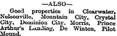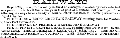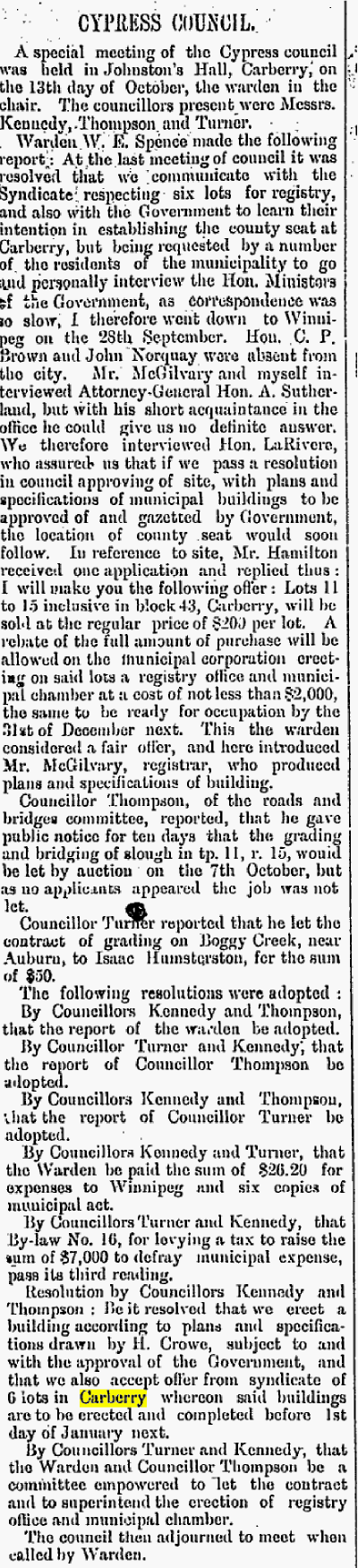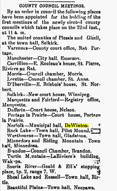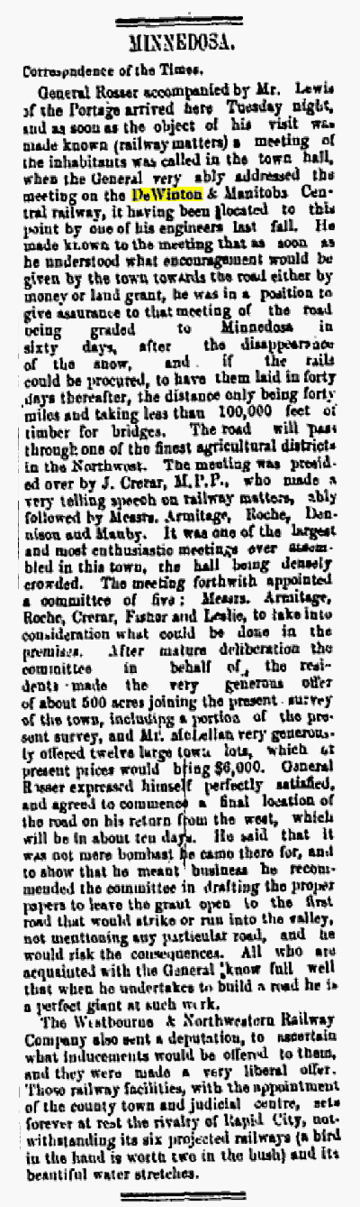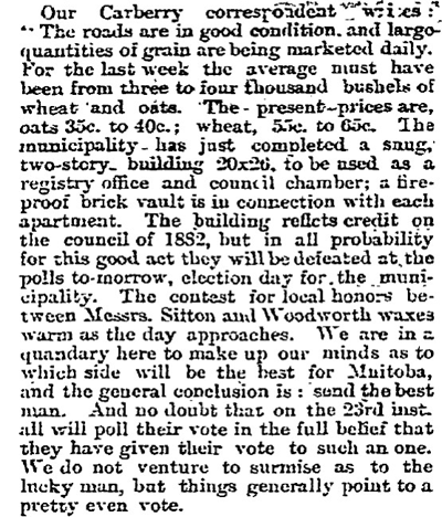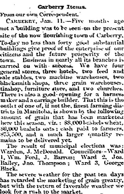 Contemporary News Reports In the 1880’s and 90’s The “Big City” newspapers from Brandon and Winnipeg did pay attention to events on the “frontier”. Other records will give us statistics, names and numbers; but it is through newspapers that we get a feel for the times. * Complete copies of many publications are now available online at www.manitobia.ca. * Manitoba's Legislative Library has numerous Manitoba Newspapers on Microfilm and available via Inter-Library Loan. 1882 ![]() Jan 7, 1882 - Winnipeg Daily Sun ![]() March 1, 1882 - Winnipeg Daily Sun ![]() March 3, 1882 Winmnipeg Times ![]() Winnipeg Daily Times, April 5, 1882 Winnipeg Daily Times, August 14, 1882 ![]() Winnipeg Daily Times, August 18, 1882 ![]() Winnipeg Daily Times, August 29, 1882 ![]() Winnipeg Daily Sun, October 20, 1882 ![]() Oct 23, 1882 - Winnipeg Times ![]() Nov. 1, 1882 - Winnipeg Times ![]() Nov. 25, 1882 - Winnipeg Daily Sun Presbyterian News ![]() Dec. 14, 1882 Winnipeg Times 1883 ![]() Jan 3, 1883 - Winnipeg Daily Sun ![]() Jan 12, 1883 - Winnipeg Daily Sun ![]() Nov. 22, 1883 - Winnipeg Daily Sun ![]() Jan 14, 1884 - Winnipeg Times ![]() Winnipeg Daily Sun, May 18, 1884 ![]() Portage La Prairie Weekly, October 31, 1884 ![]() Portage La Prairie Weekly, November 7, 1884 |